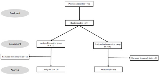 Between February and August 2022, 40 eligible participants were screened, of whom 37 agreed to participate in the study (Figure 1). All fulfilled the entire study protocol and were analyzed. Their demographic data and baseline characteristics are outlined in Table 1. All outcomes did not significantly differ between both groups at baseline except for the prevalence of osteoporosis.