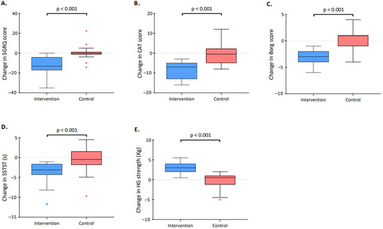 Change in clinical parameters over the study period. The figure describes the pre–post difference in both the control group (red) and the intervention group (blue) for the (A) Saint George’s Respiratory Questionnaire (SGRQ) score; (B) COPD assessment test (CAT) score; (C) Borg score; (D) five repetitions of the sit-to-stand test (5STST); and (E) handgrip (HG) strength. The boxes indicate the 25th and 75th percentiles; horizontal lines within boxes indicate the median; whiskers indicate the highest and lowest values within the 1.5× interquartile range; and dots beyond the whiskers indicate outliers.