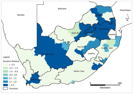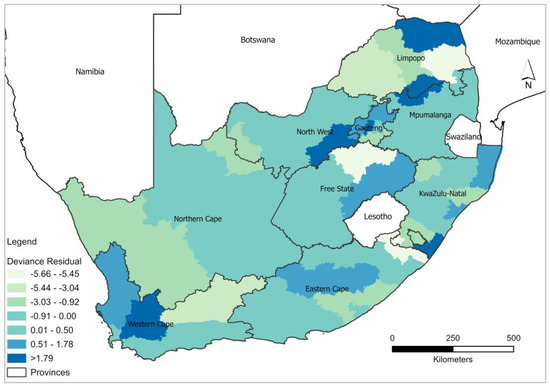 GWPR was computed to analyse the influence of covariates on modelling HIV/AIDS self-testing uptake and the result showed a slight improvement in local model performance compared to the global model (Table 2). Furthermore, the percent deviance explained by the GWRP model indicates high rates of association between covariates (excellent health, more than 6 months after last visit to the health professional, and at least having attained Grade 7–12) and HIV/AIDS self-testing uptake. The deviance residual analysis of GWPR confirms the superior performance of the local model in comparison to the global model. The deviance residual from the estimated parameters of GWPR shows spatial independence (Figure 3). High negative deviance residuals ranging between −5.66 and −5.45) were observed in Mopani and Fezile Dabi districts around Limpopo and Free State. On the contrary high positive deviance residuals (1.79–3.67) were observed in Vhembe, Sekhukune (Limpopo), City of Johannesburg (Gauteng), Dr Kenneth Kaunda (North West), Ugu (Eastern Cape), and Cape Winelands (Western Cape). Overall, the results displayed in Figure 3 validate and indicate that GWPR explains better the variability in the data and provides favourable results for explaining the relationship between HIV/AIDS self-testing uptake and the covariates in different districts.