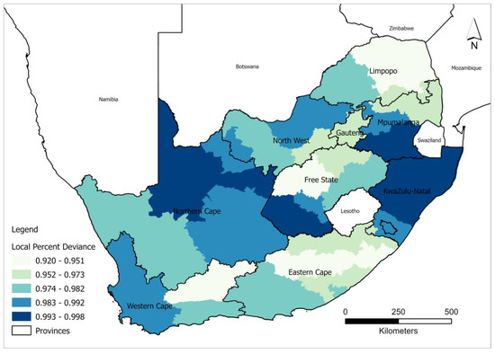 The local percent deviance explained shows spatial variation in the explanatory power of the GWPR model across different districts in South Africa in terms of predicting the relationship between HIV/AIDS self-testing uptake and the covariates (Figure 4). A significantly lower AICc is indicative of the existence of heterogeneity among different explanatory features and this heterogeneity, however, cannot be captured by the global model. The local percent deviance ranged between 90.2 and 99.7 and all the districts show the best fit (greater than 90 percent deviance explained) which best explains the relationship between HIV/AIDS self-testing uptake. The low predictive power was recorded and well distributed in the districts around Limpopo such as Vhembe, Capricorn, and Mopani; Lejweleputswa in Free State; Central Karoo in the Western Cape; and Chris Hani alongside O.R. Tambo, in the Eastern Cape. In contrast, very high percent deviance values were recorded in ZF Mgcawu, in the Northern Cape, and most districts in KwaZulu Natal including Zululand, Amajuba, King Cetshwayo, Lembe, eThekwini, and Umkhanyakude.