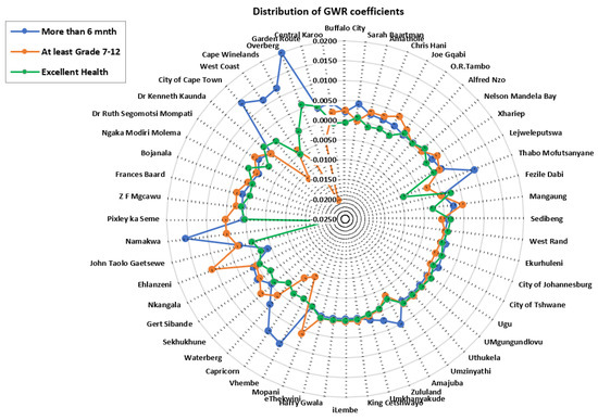 With notable variance in the strength of GWPR coefficients, the study identified districts with both significant positive and negative relationships between each explanatory variable and HIV/AIDS self-testing uptake. Figure 5 highlights comparisons of covariates (at least having attained Grade 7–12, more than 6 months after having visited a health professional and excellent health) in explaining the model. A negative relationship of “at least having attained Grade 7–12” with HIV/AIDS self-testing uptake was prevalent in districts around Limpopo (Vhembe and Capricorn) and Western Cape (Overberg and City of Cape Town). This reveals the relatively weak prediction power of (having attained at least Grade 7–12) education level in explaining HIV/AIDS self-testing uptake. It is imperative to focus on initiatives targeting educational institutions specifically for Grade 7–12 students in those districts. The authors of [2] associated socioeconomic differences with the uptake of HIV/AIDS testing in South Africa and reported an increased likelihood of testing from respondents with secondary education. Such remarks show low uptake in populations with limited education attributed to possible ignorance in interpreting the self-testing results and potentially making mistakes throughout the whole process of self-testing. Overall, HIV/AIDS self-testing services must be accessible to age groups engaged in sexual activities. Attaining at least Grade 7–12 improves one’s HIV/AIDS knowledge, since Grade 7–12 curriculum covers aspects related to sex education and there would be discussions on the importance of HIV/AIDS status awareness [35]. A significant positive association was established in Namakwa, Pixley ka Seme, Mopani, Sekhukune, and Ehlanzeni districts. This result shows that various individuals feel confident enough to perform self-testing with the confidence of being error-free and having enough knowledge to carefully read and interpret the results.