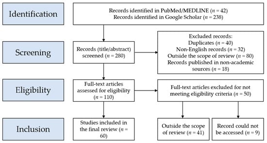 Afterward, full screening of the remaining records (n = 110) was carried out with the exclusion of an additional 41 records that fell outside the scope of the current review. An additional nine records were excluded due to the inability to access the full text of these records, being subscription-based. This yielded a total of 60 records eligible for inclusion in the current review.