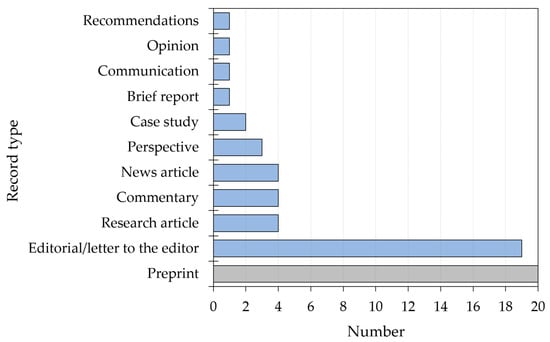 One-third of the included records were preprints (n = 20), with the most common preprint server being medRxiv (n = 6, 30.0%), followed by SSRN and arXiv (n = 4, 20.0%) for each. Editorials/letters to editors were the second most common type of included records (n = 19, 31.7%).
