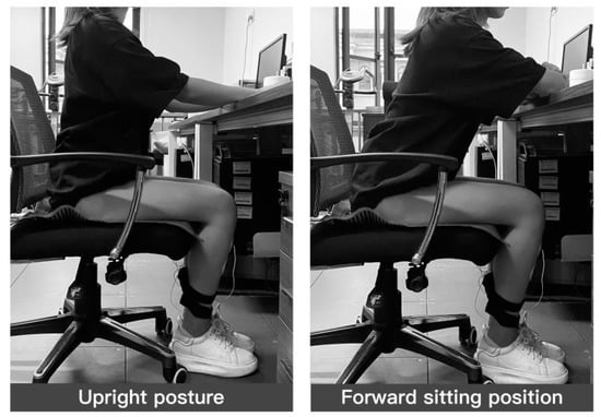 As described in Section 1, the experiment took two sitting postures, forward-leaning and upright, and the sitting posture holding time was specified with reference to the findings of Sun Xinxin et al. [21]. The average time to maintain a forward-leaning sitting posture was 11.6 min, after which the torso would alternately lean forward and backward to relieve body fatigue, and the average holding time for upright sitting posture was only 2.8 min. Considering the limited holding time of the two sitting postures, in the experiment, subjects were required to maintain two sitting postures for 2 min for upright sitting and 10 min for forward-leaning sitting, respectively, while the experimental sitting posture criteria were determined as follows: upright sitting posture was determined as the user’s subjective perceived ideal sitting posture. The forward-leaning sitting posture was a forward tilt of the trunk centerline of less than 20° [42].