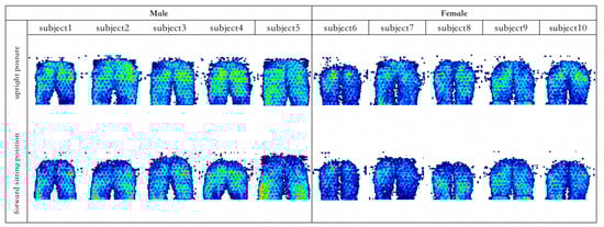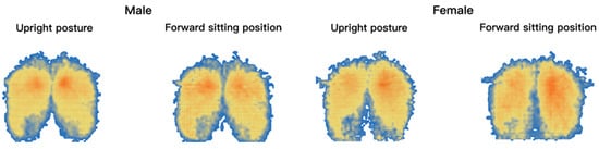 According to the results of 2.3.1, the pressure distribution maps were classified according to gender and divided into four categories: male upright and forward sitting, female upright and forward sitting. Figure 4 shows the human body pressure distribution of the top 10% of the samples in the comparative test.