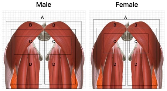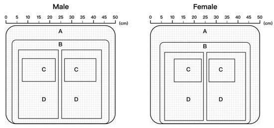 The results of the study by kazushige et al. [45] showed that the cushion area could be divided as shown in Figure 3, with zone A being the 4 cm × 4 cm area under the sciatic bone, zone B being the 10 cm × 10 cm area around zone A, zone C being the entire buttock area, and zone D being the area outside zone C and including the leg area, and based on the results of this study, the size of the sciatic tuberosity area was obtained. This was to facilitate the acquisition and processing of body pressure distribution data, to predict the position of the sciatic tuberosity, to ensure that the sciatic tuberosity position was basically the same when the subjects were in the experiment, and to ensure that the data was not shifted when the body pressure distribution matrix was subsequently averaged to ensure accuracy.