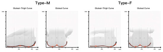 According to the human dimensions of Chinese adults provided by the China national standard GB10000-88, 573 ergonomic data samples of human body dimensions in sitting posture were collected using a shape ruler and a Martin measuring instrument. The samples were classified according to gender, and the contour curves of the buttocks and thighs of different genders were obtained. The ergonomic nodes corresponding to each zone in the curve are marked, and the median of the coordinates of each node in the group was calculated. The results are shown in Figure 9.
