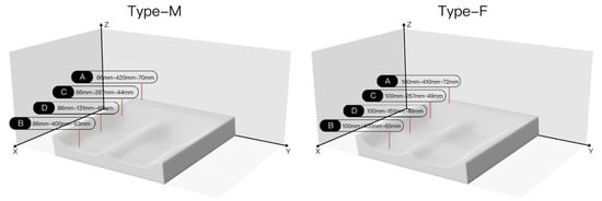 The analysis method described in Section 2 is used for the comparative analysis of data on the two sitting postures. The average pressure, peak pressure, maximum pressure gradient, average pressure gradient, and ideal values of each zone are compared between the prototype and the control group (Figure 14). The following information can be found, as shown by the mean pressure, the data range of each region of the prototype is significantly narrower and more concentrated in distribution, and the median value of the prototype is closer to the ideal value described in Table 4 when compared with the control group. The values of subdivisions B and D are closer to the ideal value, with only +0.09 and +0.11 for males and females in subdivision B, respectively, and −0.01 and—The peak pressure structure is similar to the mean pressure, with the median values in each region of the prototype being closer to the ideal, especially in subpart B, which shows a better approximation with a difference of +0.46 and −0.07. In terms of the maximum pressure gradient, region B of the prototype has an advantage of +0.06 and +0.19 for males and females, respectively. On the contrary, in females, the values in regions C and D are significantly lower than the ideal values. In terms of mean pressure gradient, the median value distribution of each subdivision of the prototype was better than that of the control group, but the difference was not significant, with region C being the closest and almost equal to the ideal value. In summary, the data distribution of the prototype tends to be more concentrated. The data range of the prototype is significantly reduced, and the median values are closer to the ideal values. In particular, the median values of zones C and D are closer to the ideal value.