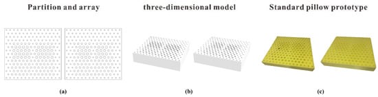 The distribution of the mapped hole matrix is obtained using the RHINO parametric modeling tool, as shown in Figure 12a,b. According to these distributions, 35D polyester fiber is used as the material to make a standard ideal support pillow prototype, as shown in Figure 12c. The equivalent elastic coefficient values of the key ergonomic node mapping positions in each area are measured, as shown in Table 8.