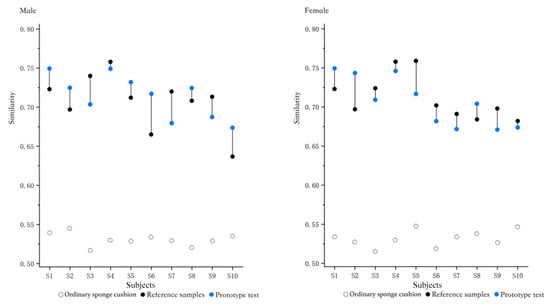 In addition to restoring the ideal body pressure indicators in each partition, the similarity of the pressure distribution matrix is also an important basis for evaluating whether the prototype has restored the ideal support surface. The prototype, reference sample, ordinary sponge cushion and ideal pressure distribution matrix were calculated separately for similarity, and the results are shown in Figure 15 below. Among them, the ordinary sponge cushion is the average perforated sponge cushion (hole specification is the smallest hole diameter of 4.2), and the size specifications are all consistent with the sponge used in the prototype. The results show that the similarity between each sample and the ideal pressure distribution map is much higher than that of the ordinary sponge cushion, and the performance is also superior compared with the reference sample. The similarity of the prototypes to the ideal pressure distribution matrix was relatively consistent across all subjects in the male data, indicating that the ideal support for men was achieved. In contrast, the female data showed greater fluctuations, with no significant difference in the similarity of the prototypes compared to the reference sample. Only some (3/10) of the samples had better similarity than that of the reference sample, with the remaining others (7/20) having slightly lower similarity than the control pillows. The support surface requirements for women are more complex compared to men and require more experimental studies.