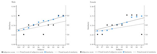 The prototypes are sorted from low to high according to the similarity of the ideal pressure distribution matrices, and the subjective evaluation scores of the prototypes obtained are compared, as shown in Figure 16. The trend between subjective evaluation and similarity is somewhat consistent. The agreement between the subjective measurements and similarity was slightly greater for men than for women. It can be seen that the similarity with the ideal pressure distribution matrix characterizes the comfort evaluation to a large extent and also reflects that the ability to reproduce the ideal pressure distribution matrix is an important indicator for evaluating the comfort of the sitting surface.