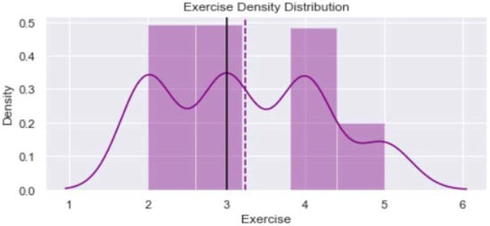 Figure 1 shows distribution of the variable “Age_year”. The minimum value is 40 years and maximum is 65 years. The verticle line divides the surface area between Q2 quartile (52 years) and Q3 quartile (56 years). Figure 2 provides dustribution of the variable “Body mass index” with minimum value of 16.9 kg/m2 and maximum value of 56.5 kg/m2. Figure 3 shows dustribution of the variable “DiabetesTime” with minimum and maximum values bewteen 2 years to 13 years. Figure 4 shows the distribution of the variable HbA1c (%) with minimum and maximum values between 6.8% to 13.2%. Figure 5 displays the distribution of the variable “Execise” with minimumand maximum values between 3 to 5 dyas/week. Figure 6 shows the distribution of variable “income”.