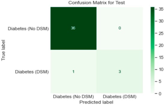 The confusion matrix in Figure 10 shows that 36 patients with type 2 diabetes were correctly classified by the neural network classifier as following DSM targets. None of the type 2 diabetes patients was misclassified by the neural network classifier.