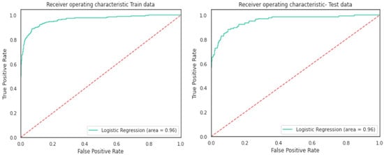 Logistic regression analysis was carried out using Python Programming, splitting the data into the training set (80%) and test set (20%). The logistic regression model’s performance was evaluated based on the confusion matrix. The accuracy of the training set was 98%, while the test set’s accuracy was 97.5%; each set had a recall rate of 79% and 75%, respectively. The confusion matrices for the training and test sets are displayed in Figure 8 and Figure 9, respectively. Figure 10 shows the results of the Receiver Operating Characteristics (ROC) curves for training and test data. The area under the curve (AUC) is 0.96 on training and test sets.