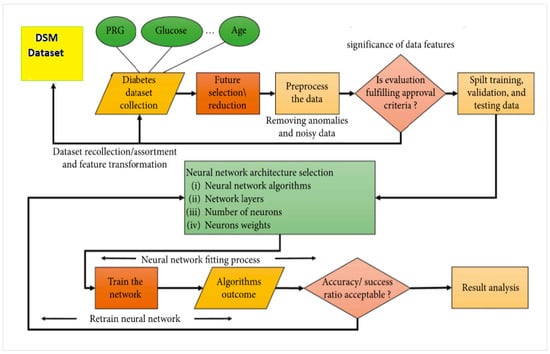 In this study, the process of using ANN algorithms to forecast, validate, and test the network to improve diabetes patients’ self-management is displayed in Figure 11. The framework requires the network to collect 200 diabetes patients’ self-management data. Due to noise or null data, various features (diet, exercise, glucose testing, age, formal education, diabetes duration, HbA1c levels, etc.) in the dataset may confuse the results. To minimise errors, we carefully selected these features using the data-pre-processing.