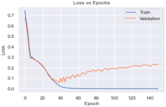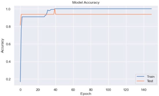We added 128 neurons in the first hidden layer and used the ReLU activation function. In the second layer, we added 64 neurons with the ReLU activation function; in the third hidden layer, we added 32 neurons. The output layer contained only one neuron and used sigmoid as an activation function. The accuracy was 100% on the model evaluation of the training and test data. The model was overfitting (as may be observed from Figure 14), but the model accuracy was promising (as shown in Figure 15).