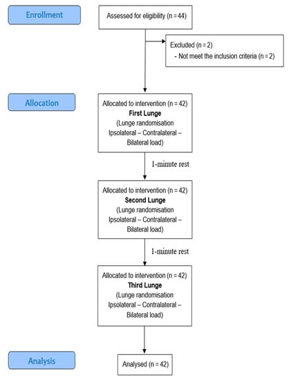 Once the data for the normalization of EMG were obtained, the lunge was performed with different load placements (unilateral, contralateral, and bilateral). The order of the exercises, as well as the front leg, were previously randomized. For the randomization process, a randomization list was generated before the athletes were recruited using a computer program (www.random.org) that generated a list of random numbers. Subjects performed all three exercise modalities and thus ended their participation in the study (Figure 1).