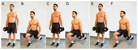 One of the exercises in which weight distribution can be modified with dumbbells is the lunge [11,12]. The lunge is a unilateral multi-joint leg exercise that involves knee and hip extensor muscles. A lunge consists of taking a step forward and then lowering the rear knee until it almost touches the ground, reaching a hip and knee flexion close to 90°, and then returning to the starting position. The step distance is approximately 65% of the length of the limb (±5%) [13]. This closed-kinetic-chain exercise is commonly performed in gyms and rehabilitation centers because of its similarity to everyday movement patterns [14,15,16].