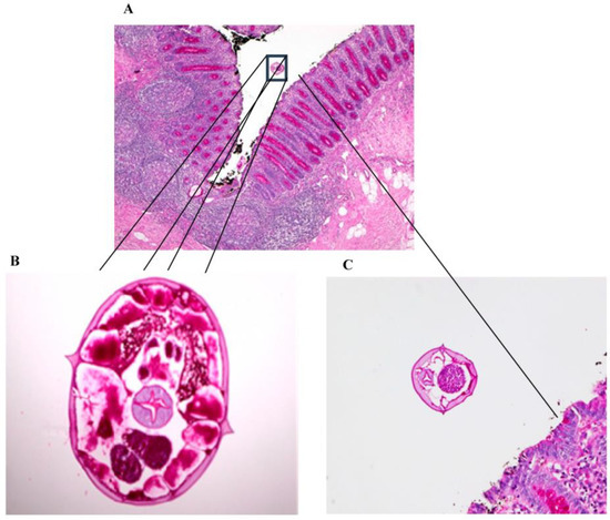 (A) Periodic acid–Schiff (PAS), magnification 40×. (B) Periodic acid–Schiff (PAS), magnification 200×, of female Enterobius vermicularis worms with eggs. (C) Periodic acid–Schiff (PAS), magnification 200×, showing worm in the lumen.