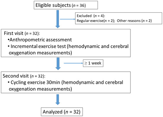 Cerebral oxygenation can serve as an index of cerebrovascular function, as it depends on blood flow and endothelial integrity [11]. Near-infrared spectroscopy (NIRS) assesses cerebral oxygen delivery and uptake by cerebral tissues through the measurement of oxy- (O2Hb) and deoxygenated hemoglobin (HHb), which provides information on cerebrovascular function [12]. During exercise, cerebral oxygenation increases in healthy humans due to an increase in regional total hemoglobin (tHb) and O2Hb [13]. This increase in oxygen delivery is important because brain function can deteriorate when oxygenation is reduced. Subjects with obesity are at risk of cerebrovascular dysfunction; however, few studies have examined their cerebral oxygenation response to exercise.