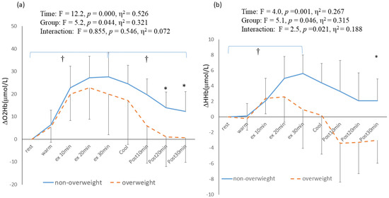 Cerebral oxygenation responses during the 30 min continuous exercise and post-exercise period; (a) cerebral oxygenated hemoglobin (Δ O2Hb); (b) cerebral deoxygenated hemoglobin (ΔHHb). Ex: exercise. †: significant difference within group (p < 0.05). *: significant difference between group (p < 0.05).