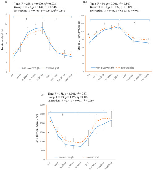Hemodynamics responses during 30 min of continuous exercise and the post-exercise period. (a) Cardiac output; (b) stroke volume; (c) systemic vascular resistance index (SVRi). Ex: exercise. * p < 0.05, between-group difference. †: significant difference within group (p < 0.05).