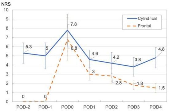The required opioid dose had returned to baseline by POD 4, demonstrating that postoperative pain is a manageable symptom. NRS decreased slightly to POD 3 for both frontal and cylindrical diffusers.