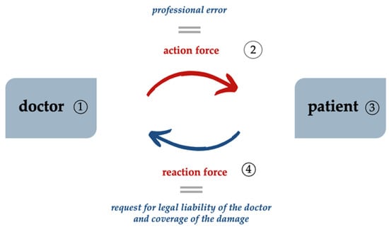 Professional errors committed in the exercise of medical activities within the doctor-patient relationship can be considered by applying the third principle of mechanics—the “Principle of Action and Reaction”—i.e., when one body acts on another body with a force (called the action force), the second body also acts on the first body with a force (called the reaction force), having the same magnitude but an opposite direction. In this sense, we note the existence of two “bodies”—i.e., the doctor and the patient. The medical action (1) in which a doctor makes a professional error (force of action) (2) generates the patient’s reaction force (3); the patient identifies the damage and the reaction force is equal to the patient’s decision to fight back and seek legal liability in a court and/or compensation for the damage (4) (Figure 1).