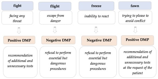 At the same time, the defensive attitude could be justified based on the psychological perspective of an individual’s need for protection. The fear of a potential legal process as a result of harming a patient induces a state of constant caution in a doctor, making the process of treating the patient and the doctor–patient relationship much more difficult. Thus, a doctor may resort to an “effective” method of protection—defensive medicine. Such actions taken by a doctor can be analyzed by means of the psychological concept of “fight or flight”—the behavioral reaction of an individual in response to stress—concept defined by Professor Cannon in 1915 []. Over time, the concept has been expanded to a broader “fight, flight, freeze or fawn” model, by which we understand a person’s fight, flight, freeze, or fawn response [].