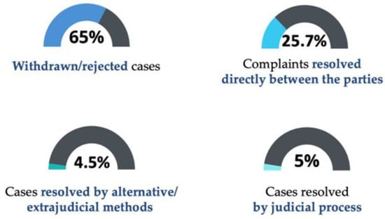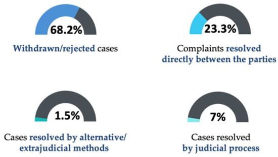 In 2015, another study based on the same evaluation indicators showed the following: 68.2% of the claims made were rejected/withdrawn; 23.3% of the claims were resolved directly; and 7% of the claims were resolved before a court (Figure 6) [].