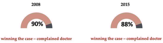 Of the total number of claims that reached a court— 5% in 2008 and 7% in 2015—the vast majority resulted in decisions in favor of the doctor (90% in 2008 and 87.5% in 2015) [] (Figure 7).