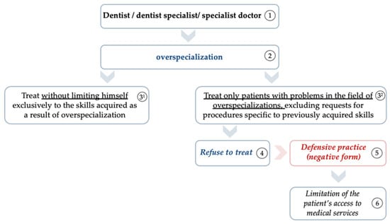 In specific situations (excluding those in which dentists, specialist dentists, and specialist doctors decide to follow an overspecialization program to justify their passions for a certain type of practice) this decision can sometimes reflect a conscious reaction to exclude the possibility of a future error and to remove the fear of a possible mistake by acquiring an impressive level of automatism in a certain field. This reaction could be interpreted as a possible action specific to a negative defensive medical practice, as illustrated in Figure 9.