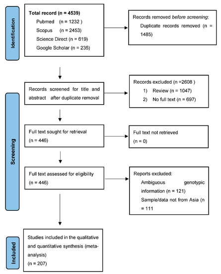 An initial 4539 abstracts were recovered from five international electronic databases using our search approach. All duplicates were removed, and 2608 articles were discarded based on their titles and abstracts. A total of 446 papers were eligible for full-text evaluation, but 232 were rejected because they did not meet our inclusion criteria or had a low J.B.I. assessment score. Figure 1 shows a full overview of the selection procedure. This systematic literature review and meta-analysis included 207 publications of 49,279 HBV genotypes.