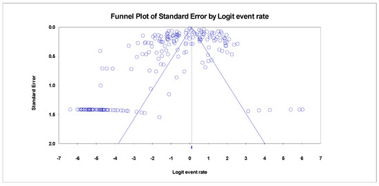 A funnel plot showing no publication bias for HBV genotype C in Asia (Egger’s p = 0.00001).