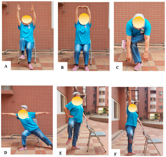 The various chair yoga positions performed by participants are shown in this figure. Some examples are (A) reaching both arms forward and waving them up and down, (B) seated mountain pose, (C) down dog with chair, (D) hero pose, (E) Lifting the knees while standing, (F) tree pose.