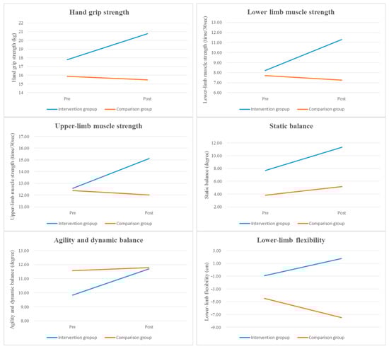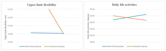 The results of between-group comparisons in functional fitness and daily life activity scores are shown in Table 3 and Figure 2. Hand grip strength, lower- and upper-limb muscle strength, static balance, agility and dynamic balance, lower-limb flexibility, and daily life activities significantly improved in the intervention group when compared with the comparison group at post-test (all p < 0.001), and there was a statistically significant difference in the scores of the intervention group (Scheffe’s test result: ① > ②). However, no significant between-group differences were observed for upper-limb flexibility at post-test (p = 0.965). Moreover, the chair yoga activity program considerably increased the participants’ daily life activity scores, with the Cohen’s d effect size of the intervention being 3.06.