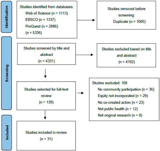 | EBSCO (N = 1337) | (“CO-CREATION” OR “OPEN SCIENCE” OR “COMMUNITY NETWORKS” OR “COPARTICIPACION” OR “INTEGRATED GOVERNANCE” OR “COLLABORATIVE LEADERSHIP” OR “PARTICIPATORY ACTION RESEARCH” OR “COPRODUCCION” OR “CO-DESIGN” OR “CITIZEN SCIENCE” OR “CITIZEN ENGAGMENT” OR “CO-OPERATION” OR “HUMAN CENTERED DESIGN”) AND (“PUBLIC HEALTH” OR “PUBLIC POLICIES” OR “HEALTH POLICIES” OR “POLICY-MAKING PROCESS” OR “HEALTHCARE POLICIES” OR “HEALTH PROGRAMS” OR “HEALTH PROGRAMME”) AND (“EQUITY” OR “HEALTH PROMOTION” OR “INEQUALITIES” OR “INEQUITIES” OR “INEQUALITY” OR “INEQUITY” OR “DISPARITY” OR “DISPARITIES”) |