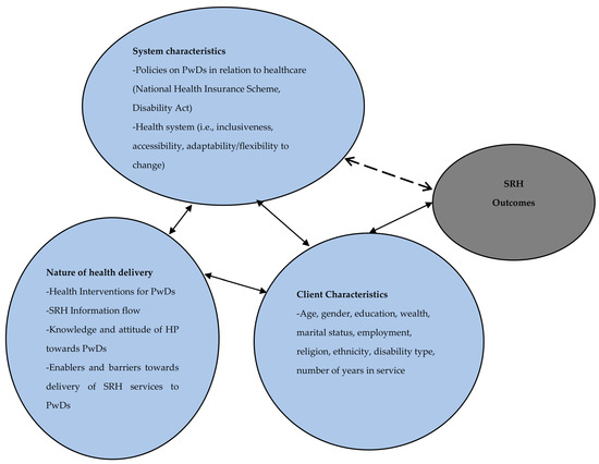 Discussing the findings within the health outcomes model (Figure 1), Mitchell et al. [25] and Radwin [26] point to the interplay between system characteristics, the nature of health delivery, and how a complicated interaction between supply and demand affects access to SRH healthcare among PwDs. For instance, it was found that barriers to SRH health delivery resulted from the healthcare system’s incapacity to cater to the healthcare needs of PwDs in the form of inadequate HPs, unfriendly health infrastructure, and inadequate logistics. This pattern is also consistent with a previous study in Ghana that there is a mismatch between the supply and demand of HPs [48].