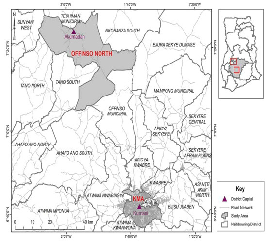 - GIS. GIS Unit of Department of Geography and Regional Planning UCC, Cartographer Map Showing Study Area in Kumasi Metroplolis and Offinso North District; GIS: Accra, Ghana, 2022. [Google Scholar]