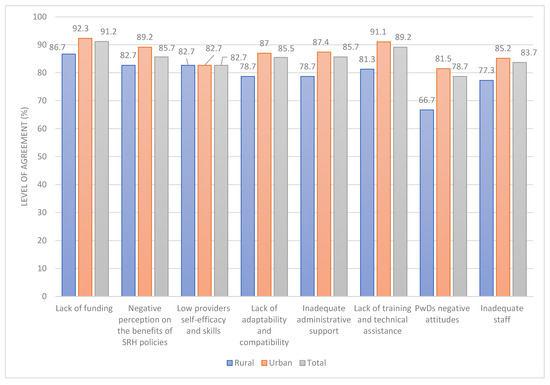 Figure 3 presents the results of HPs’ perception of factors hindering the delivery of SRH services to PwDs. The majority (92.3%) of HPs in the urban areas indicated that lack of funding to support SRH services delivery was a major barrier. Lack of training and technical assistance to provide services to PwDs (91.1%), negative perception (89.2%) of the benefits of the SRH policy or programs to PwDs, and inadequate managerial/supervisory/administrative support (87.4%) were the top four barriers indicated by HPs in the urban area. Likewise, the top four barriers for HPs in rural areas were lack of funding (86.7%), low provider self-efficacy and skills to deliver SRH services (82.7%), negative perception (82.7%) of the benefits of the SRH policy or programs to PwDs, and lack of training and technical assistance (81.3%) (See Figure 3).