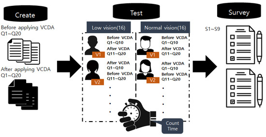 First, the time taken for visual information recognition before applying VCDA was 160.76 s for participants with low vision and 130.92 s for participants with normal vision. That is, the difference was 29.84 s. The difference between the two may seem minor but is a substantial gap. This outcome indicates that a person with low vision consistently loses 29.84 s whenever they engage in activities. This gap in visual information recognition speed will result in various social problems.