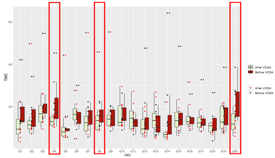 Looking at the results for each question, when Group A used VCDA, three cases showed a statistically significant decrease (Q4, Q8, Q20), 15 showed a decrease (Q1, Q3, Q5, Q7, Q9-Q15, Q18, Q19), and two were maintained (Q16, Q17). In group B, one case showed a statistically significant decrease (Q10), 18 showed decreases (Q1–Q9, Q11–Q17, Q19, Q20), and one was unchanged (Q18) (Table 6, Figure 3).