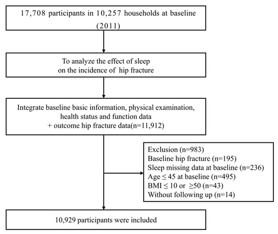 This study used the China Health and Retirement Longitudinal Study (CHARLS) dataset to investigate socioeconomic determinants and consequences of aging. This is an on-going, nation-wide representative longitudinal health survey of residents aged over 45 years and older from 450 villages or communities in 150 districts of 28 participating provinces, with follow-up every two years. The description and questionnaire of the CHARLS have been described elsewhere [40,41]. In this study, we utilized data from the CHARLS 2011 (wave 1) and 2015 (wave 3). The baseline survey of wave 1 included a total of 17,708 participants, and wave 3 included 20,517 participants. After consolidating the baseline files, 11,912 participants remained. Besides, 14 subjects were excluded due to lack of follow-up in 2015. The 195 subjects that reported hip fracture at baseline and the 236 subjects missing sleep duration and midday napping information in the baseline survey were excluded from the longitudinal analysis. A total of 495 participants aged ≤ 45 and 43 participants with BMI ≤ 10 or ≥50 were excluded. Finally, a total of 10,929 adults were included in the following analysis (Figure 1). This study was performed in line with the principles of the Declaration of Helsinki. This study was approved by the Biomedical Ethics Review Committee of Peking University (IRB00001052-11015). All subjects enrolled signed informed consent.