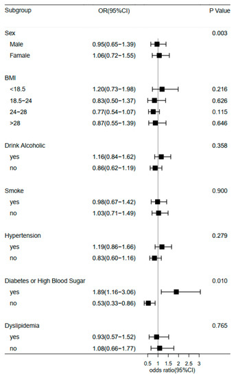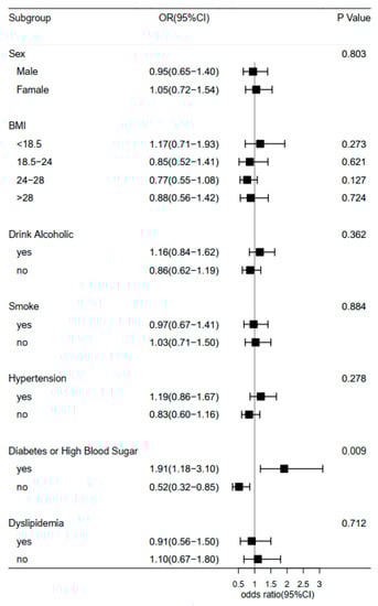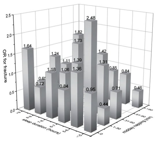 Furthermore, we examined the association of midday napping with hip fracture risk. Compared with participants who napped for 31–60 min, the multivariable adjusted ORs (95% CIs) of hip fracture were 1.27 (0.87–1.85) for non-nappers, 1.46 (0.94–2.27) for those who reported 0–30 min, 0.56 (0.17–1.82) for 61–90 min, and 1.49 (0.92–2.41) for midday napping for >90 min. This suggested that baseline midday napping time had no effect on the risk of hip fracture. Besides, upon conducting a stratified analysis using selected covariates (e.g., gender, BMI, and disease status), the association of hip fracture with sleep duration or midday napping duration seemed to be stronger among individuals who reported having diabetes or high blood sugar (Figure 3 and Figure 4). Furthermore, we assessed the joint effect of nighttime sleep duration and midday napping time on fracture risk. Compared with participants with short sleep duration (<5 h) and no midday napping behavior, we found that moderately prolonged napping time (0–30 min: OR = 0.438, 95% CI: 0.25–0.776; and >90 min: 0.455, 95% CI: 0.21–0.989) significantly decreased the risk of hip fracture (Figure 5).