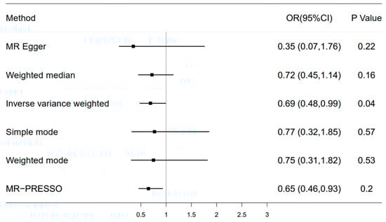 Among four sleep phenotypic studies we conducted (e.g., sleep duration, daytime napping, chronotype, and insomnia), we found a modest causal relationship between sleep duration and fracture in the main inverse-variance weighted analyses (OR = 0.69, 95% CI: 0.48 to 0.99, p = 0.04) (Figure 6). The scatter plot and funnel plot are shown in Supplementary Figures S1 and S2. For instrumental variable (IV) selection, a total of 71 single-nucleotide polymorphisms (SNPs) that have a robust association with sleep duration at the threshold of statistical significance (p < 5 × 10−8) were selected. To remove bias from linkage disequilibrium (LD), a clumping process was conducted with the European population and LD between SNPs (R2 < 0.1, kb = 3000). Finally, one SNP was excluded due to LD, leaving 70 SNPs as IVs for further analysis (Supplementary Table S1). Because the instrumental variable was selected only from the European population, 41 SNPs were not found in the GEFOS data sets. In addition, we removed three SNPs with intermediate allele frequency palindromes. As a result, estimates for 26 SNPs were included in the analysis of sleep duration and hip fracture. For sensitivity analysis, Cochran’s Q test showed that there is no significant heterogeneity for the causal effect of sleep duration on hip fracture (Q_pval > 0.05). The MR-Egger intercept test demonstrated that our results were not influenced by pleiotropy (p = 0.41). MR-PRESSO analysis showed no horizontal pleiotropy (pmr-Presso = 0.183). Lastly, the leave-one-out sensitivity analysis confirmed the stability of the causal inference (Supplementary Figure S3). However, we failed to observe a causal relationship of daytime napping, chronotype, and insomnia with fracture.