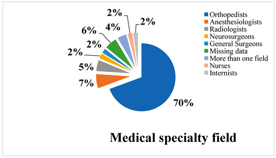 The total number of physicians and healthcare professionals involved in orthopedic professional liability prosecutions in the city of Rome from 2000 to 2015 was 456 (Figure 4). Data analysis made it clear that the most commonly prosecuted professionals were orthopedists (292) followed by anesthesiologists (28); radiologists (22); neurosurgeons (10); general surgical nurses and internal medicine physicians (9 in each of the categories); cardiologists (7); and multidisciplinary professionals (18). There were also a number of cases for which the relevant specialty field could not be identified (24), while 28 professionals belonged to various less-involved branches (pulmonology, urology, neurology, infectious diseases, hematology, gynecology, emergency medicine, and surgery, etc.).