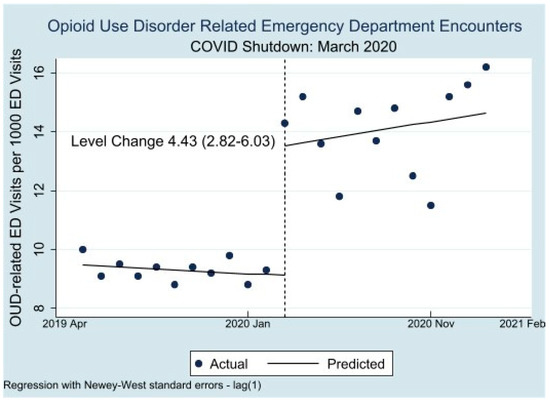 However, in our ITS analysis, among the LA County Safety net population, we saw a level increase of 3.95 (2.29–5.60) ED visits per 1000 encounters in Period 2 compared with Period 1 (see Table 3). Similarly, we saw in the Medicaid managed care population a level increase of 2.23 (1.34, 3.12) OUD-related ED visits per 1000.