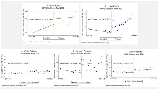 Interrupted Time Series for Opioid-Use-Disorder-related Emergency Department visits (a) High-Acuity Visits; (b) Low-Acuity Visits; (c) White Patients; (d) Hispanic Patients; (e) Black Patients.