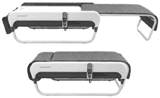The heat massage device (CGM MB-1401; Ceragem, Seoul, Republic of Korea) was run in the eighth mode (this mode provides acupressure, moxibustion, and rubbing along the spine) in the HMG study (Figure 1). Once the participant laid down on the device in the supine position, a rolling projector protruded up against the posterior aspect of the spinal column to scan its curvature along the sagittal plane from the cervical spine through to the sacrum. These rollers applied heat and massage while automatically adjusting the height of the protrusion with reference to the curvature of the entire length of the spine. All participants used the device for 40 min, once daily, 5 days per week, for a total of 4 weeks.