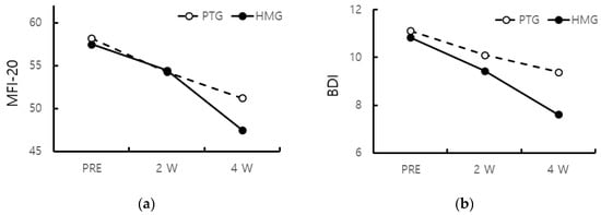 (a) MFI-20 of both groups were improved from 2 W, and the MFI-20 of the HMG improved from 4 W compared to that of the PTG (p < 0.05); (b) BDI of the PTG was improved at 4 W compared to PRE and 2 W, but that of the HMG was improved at 2 W (p < 0.05). (MFI-20: multidimensional fatigue inventory 20, BDI: Beck’s depression inventory).
